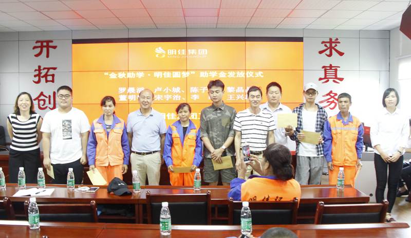 8月28日上午,明佳集團工會“金秋助學·明佳圓夢”助學金發(fā)放儀式在集團公司三樓會議室舉行,為8個考取大學的職工子女發(fā)放助學金共計9600元。總裁陳云、副總經(jīng)理鐘寒參加發(fā)放儀式,儀式由工會主席高斐斐主持。