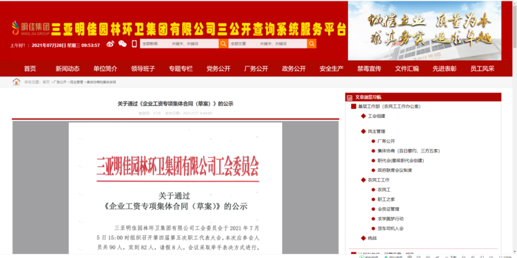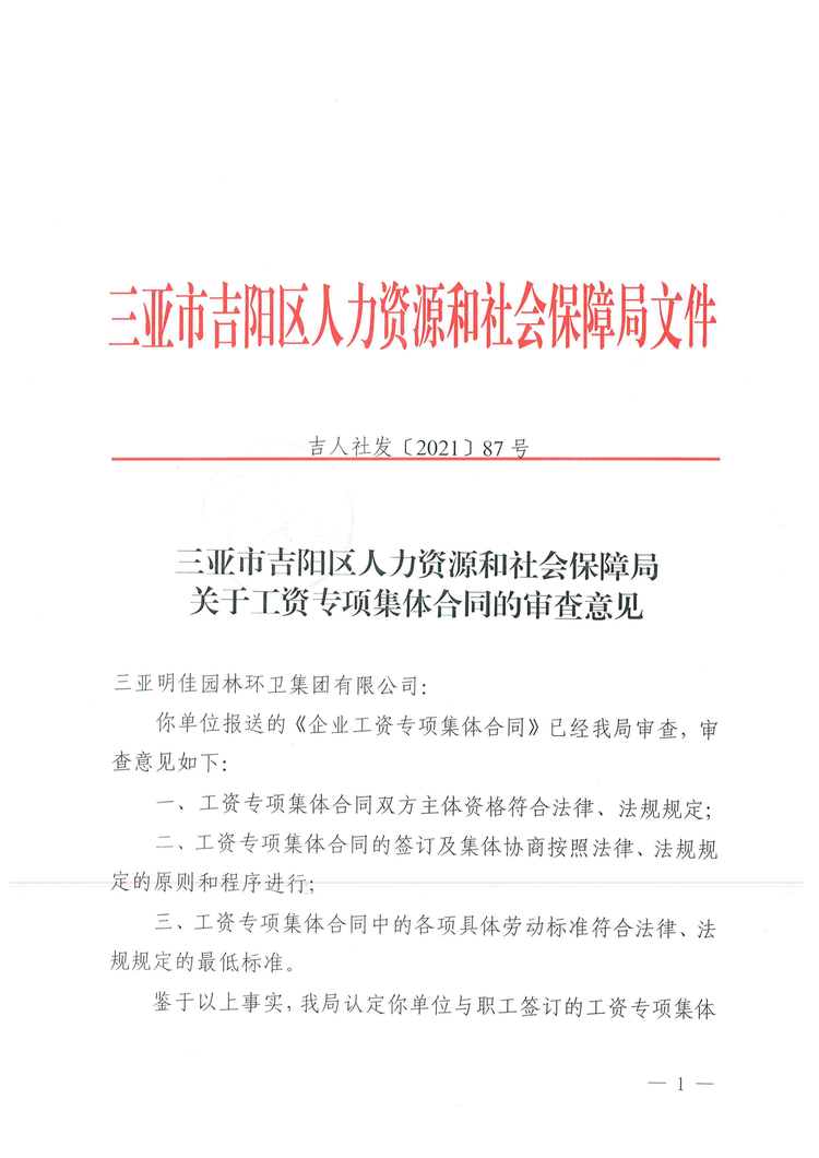 2021年8月2日,吉陽區(qū)人社局審查通過我公司《企業(yè)工資專項集體合同》。8月4日報三亞市總工會基層工作部備案。至此,三亞明佳園林環(huán)衛(wèi)集團(tuán)有限公司2021年度企業(yè)工資集體協(xié)商工作圓滿結(jié)束。