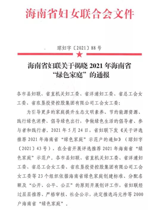 【喜報(bào)】明佳集團(tuán)羅福英家庭被評(píng)為2021年海南省“綠色家庭”