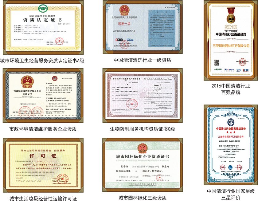 公司擁有建筑物外立面清潔養(yǎng)護(hù)施工甲級(jí)資質(zhì)、建筑物有害生物防治施工甲級(jí)資質(zhì)、建筑物日常清潔養(yǎng)護(hù)施工甲級(jí)資質(zhì)、中國(guó)清潔行業(yè)企業(yè)等級(jí)一級(jí)資質(zhì)證書(shū)、城市園林綠化企業(yè)資質(zhì)證書(shū)、有害生物防制服務(wù)機(jī)構(gòu)資質(zhì)證書(shū)C級(jí)、有害生物防制服務(wù)機(jī)構(gòu)C級(jí)資質(zhì)證書(shū)、中國(guó)清潔清洗行業(yè)國(guó)家一級(jí)等級(jí)資質(zhì)、城市生活垃圾經(jīng)營(yíng)性清掃、收集、運(yùn)營(yíng)許可證;城市生活垃圾經(jīng)營(yíng)性運(yùn)輸、處置工作許可證、環(huán)境管理體系認(rèn)證證書(shū)、城市環(huán)境衛(wèi)生經(jīng)營(yíng)服務(wù)資質(zhì)認(rèn)定證書(shū)(GB/T240012004/IOS14001:2004標(biāo)準(zhǔn))、職業(yè)健康安全管理體系認(rèn)證證書(shū)(GB/T28001—2011/OHSAS18001:2007標(biāo)準(zhǔn))、質(zhì)量管理體系認(rèn)證證書(shū)(GB/T19001—2008/iOS9001:2007標(biāo)準(zhǔn))、市政環(huán)境清潔維護(hù)服務(wù)企業(yè)資質(zhì)證書(shū)